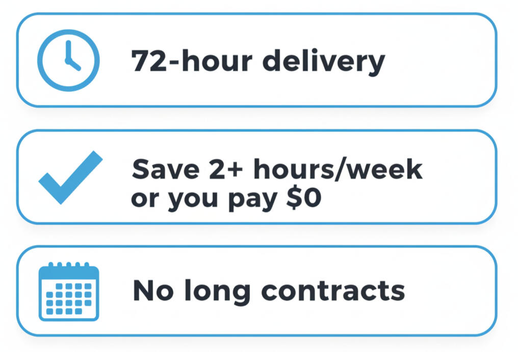 • Responses within one business day, a monthly report with success rate and time saved, and a simple plan each quarter.